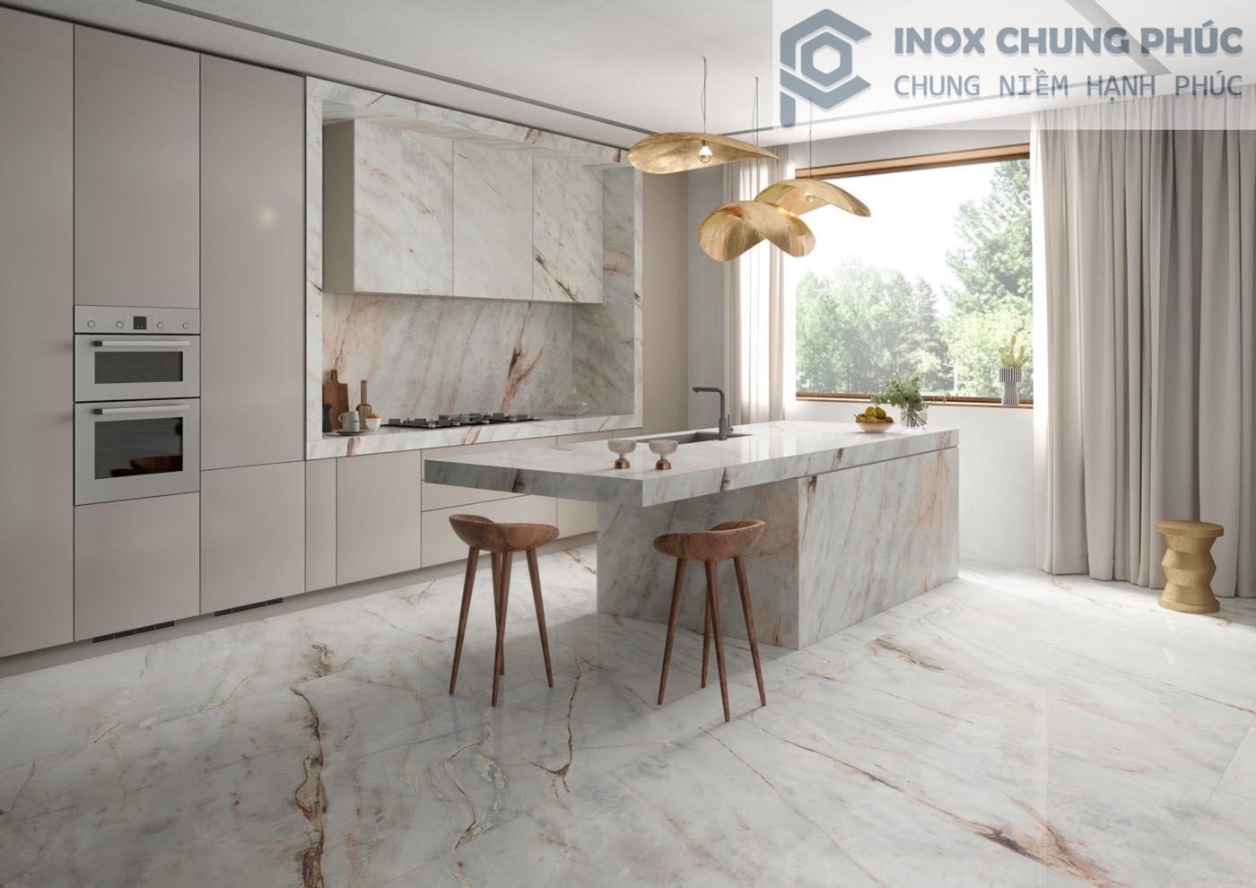 -Không gian phòng bếp, phòng ăn có thể sử dụng chung loại đá nung kết lát nền phòng khách, hãy ưu tiên chọn các mẫu đá có họa tiết đơn giản.